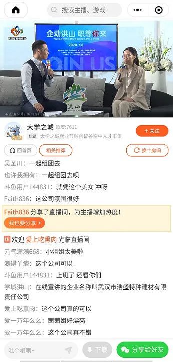 7月8日,我司参与了武汉广播电视台举办的“【企动洪山,职等你来】2020年大学之城就业节融创智谷空中人才市集”招聘专场直播活动。