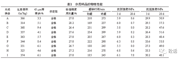 (1)水泥:选取湖北区域9家不同水泥厂生产的P·O42.5水泥,符合GB175—2007的规定,分别记为A、B、C、D、E、F、G、H、I样品。水泥的物理性能检验结果见表1。